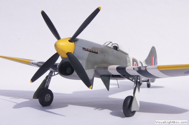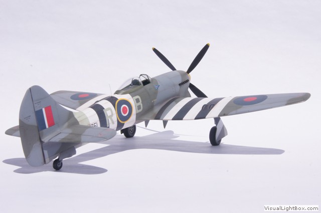 Die hier dargestellte Tempest Mk.V war die persönliche Maschine von Roland Beamont, die im Juni 1944 mit den zu der Zeit vorgeschriebenen Invasionsstreifen bemalt war.