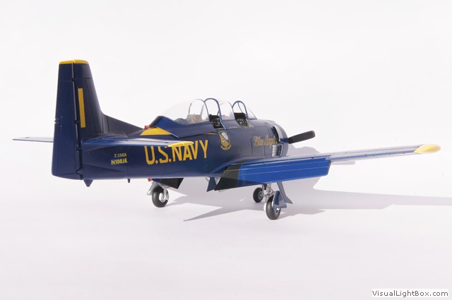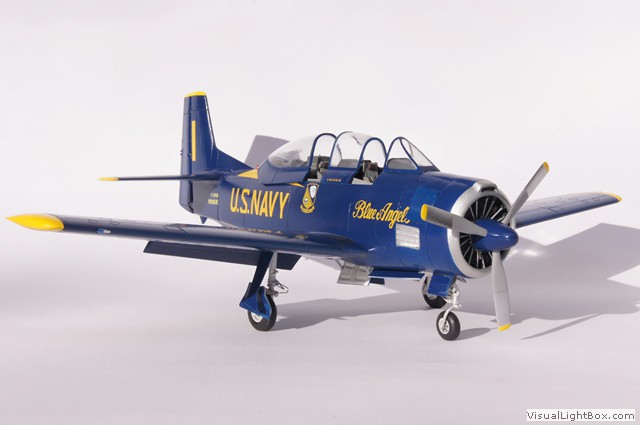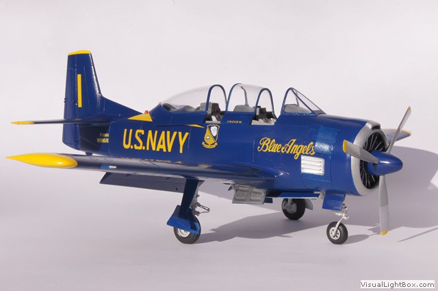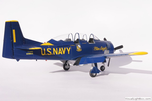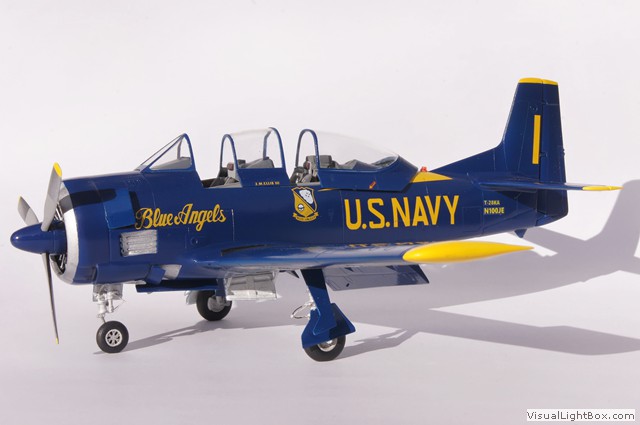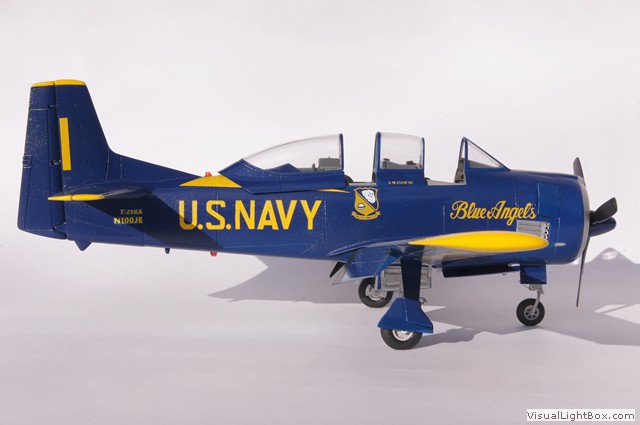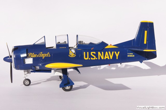Auf die Gefahr hin, dass ich jetzt feuchte Bubenträume zerstöre: Das Blue Angels Team der US Navy hatte die T-28, obwohl irgendwie nahe liegend, nie im Inventar. Trotzdem fand es ein ziviler Besitzer der Nomad N100JE irgendwie sexy, seinem Liebling einen Blue Angels Anstrich zu verpassen.