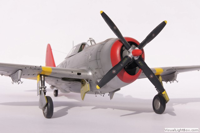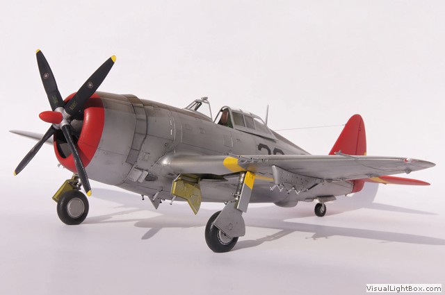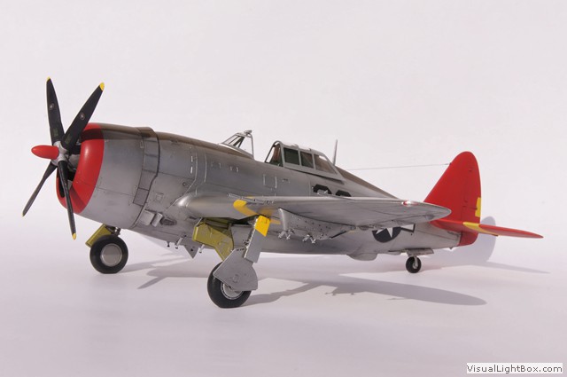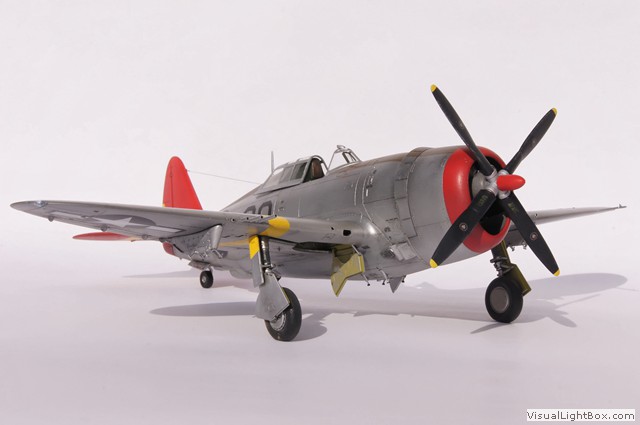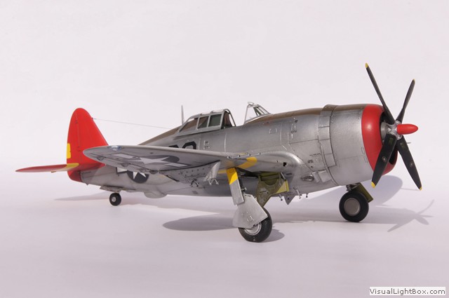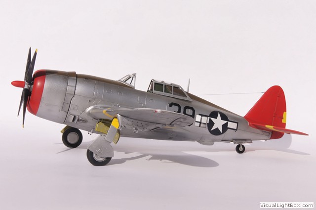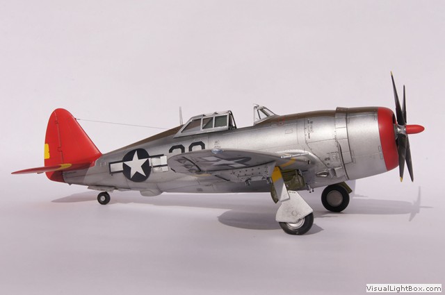 Die hier dargestellte P-47D war die persönliche Maschine von Lt. Gwynne Peirson von der 302nd Fighter Squadron, 332nd Fighter Group. Die Maschinen wurden zuvor von der 325th Fighter Group, dem "Checkertail Clan", verwendet. Die dadurch notwendige Übermalung der Leitwerke hat vermutlich zur Idee mit den legendären roten Leitwerken ("Red Tails") geführt. Am 8. Juni 1944 wurde der erste Bomberbegleitschutz-Einsatz mit P-47D geflogen, bei dem fünf Abschüsse erzielt werden konnten. Dies sollten die einzigen mit Thunderbolt erreichten Luftsiege der 332nd FG werden, da schon am 30. Juni der letzte Einsatz mit diesem Flugzeugmuster geflogen wurde, bevor endlich auf (selbstverständlich wieder gebrauchte...) P-51 Mustang umgerüstet werden konnte. Am 25. Juni 1944 flog Peirson zusammen mit seinem Flügelmann Wendell Pruitt nach einem wetterbedingt abgebrochenen Einsatz in der Nähe des Hafens von Trieste heimwärts, als vor ihnen ein Schiff auftauchte, das sie als deutschen Zerstörer identifizierten. Obwohl nicht sehr erfolgsversprechend, beschossen sie das Schiff - inzwischen unterstützt von weiteren Kollegen - mit ihren Flügel-MGs, um möglichst viel Schaden anzurichten oder wenigstens für ordentlich Verwirrung zu sorgen. Prompt landete Peirson bei seinem zweiten Anflug einen Zufallstreffer, der eine gewaltige Explosion auslöste. Möglicherweise war eines seiner Geschosse in ein Munitionslager gedrungen oder hatte eine auf Deck gelagerte Mine getroffen. Da das Schiff sich auf die Seite legte, gingen Peirson und Pruitt davon aus, es versenkt zu haben - und wurden entsprechend mit Orden dekoriert.